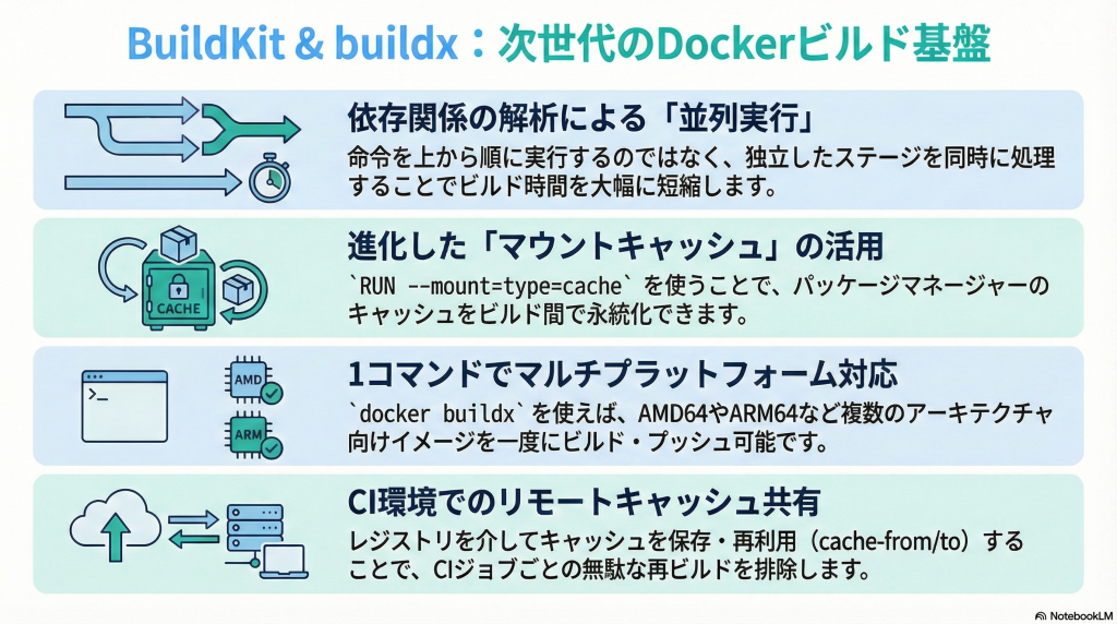 BuildKitでは、Dockerfileの構造から依存関係を解析し、「ここは独立しているから同時に実行できる」といった判断ができるようになっています。また、キャッシュを別のストレージ(レジストリやCIサービス)に保存・復元できる設計が初めから組み込まれているため、ビルドの再現性やスピードを保ちやすくなっています。さらに、フロントエンド/バックエンドという構造に分けることで、Dockerfile以外のビルドフロントエンドを追加したり、出力形式を柔軟に変えたりできる拡張性も持っています。