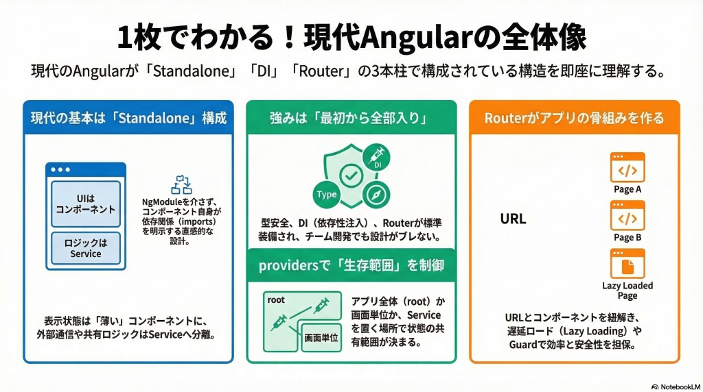 Angularは、コンポーネントでUIを分け、DI(依存性注入)でロジックを疎結合にし、Routerで画面をURL単位に整理できるフロントエンドフレームワークです。特に現代AngularではStandaloneを前提に考えることで、NgModule中心の理解よりも構造がつかみやすくなります。この記事では、Angularの強みを「型安全・DI・Router」の3本柱で整理し、コンポーネント、テンプレート、Service、providers、Guard、lazy loadingまでを1枚の地図としてつなげて理解できるようにします。
