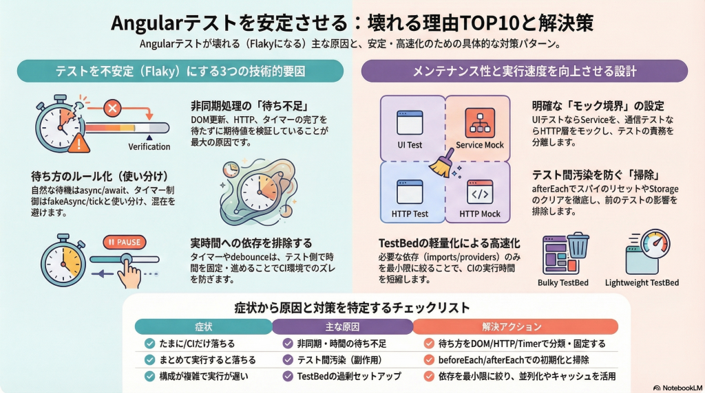 この一覧は、Angularテストが壊れたときの初動チェックとして使えます。実装バグを疑う前に、「待ち方」「モック境界」「共有状態」「速度」のどこに属する問題かを当てはめるだけで、かなり切り分けが早くなります。