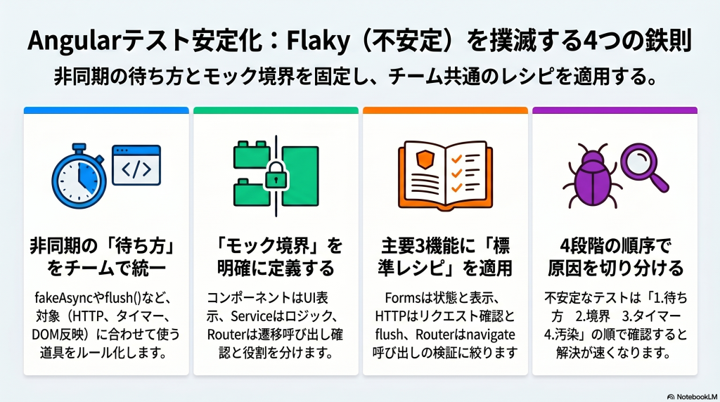Angularテストを安定させるには、非同期の待ち方をチームで統一するのが先です。毎回 waitFor、fakeAsync、whenStable() を場当たりで混ぜると、たまたま通るけれど壊れやすいテストが増えます。